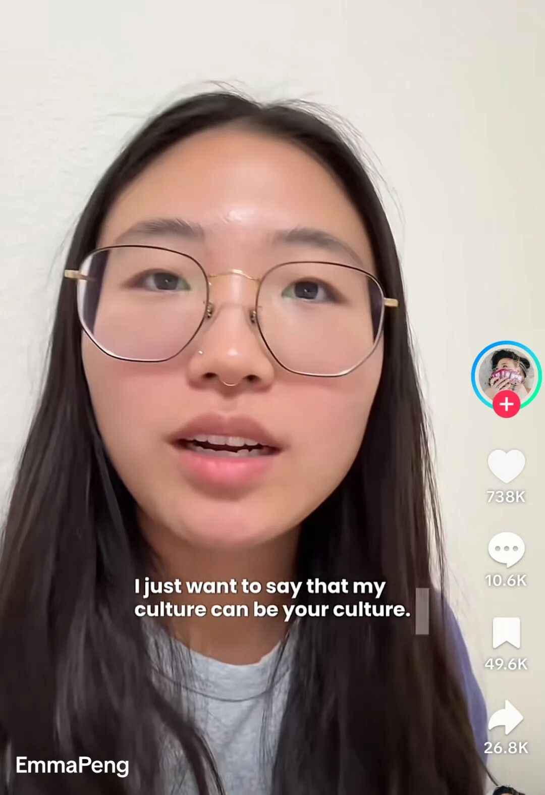 27岁的Emma Peng在中国河南长大。Emma Peng在视频中直白地宣称:“我的文化可以是你的文化”(My culture can be your culture)。(Emma Peng社交媒体截图)