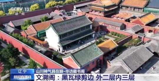 总台记者杨雪:沈阳故宫的建筑色彩丰富、鲜明,从空中俯瞰,红色的宫墙上、黄色的琉璃瓦屋顶外围还有一层绿色的剪边,红、黄、绿构成了沈阳故宫建筑的主色调,而文溯阁却因为其独有的黑瓦绿剪边,让它成了沈阳故宫之中一道最为特别的风景。